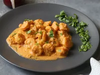 Coconut Curry Shrimp A simple, flavorful dish featuring shrimp simmered in a creamy coconut curry sauce, garnished with fresh cilantro and a hint of lime.