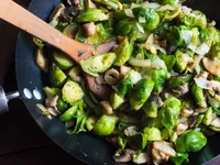 Sautéed Brussels Sprouts and Mushrooms with Rosemary A simple and classic side dish featuring sautéed Brussels sprouts and mushrooms, seasoned with rosemary and salt for a flavorful accompaniment to any meal.