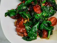 Sautéed Spinach and Tomatoes A side dish featuring fresh spinach and ripe tomatoes, sautéed with olive oil.