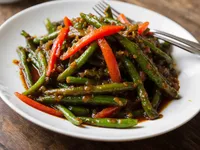 Stir-Fried Green Beans with Red Bell Pepper and Ginger A classic stir-fry dish featuring fresh green beans and red bell pepper, enhanced with the flavors of soy sauce, ginger, and sesame oil. Perfect for a quick and healthy side dish.