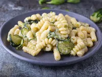 Whole Wheat Pasta with Zucchini and Goat Cheese A simple and classic pasta dish featuring whole wheat pasta, sautéed zucchini, and creamy goat cheese, seasoned with basil and black pepper.