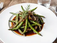 Sautéed Green Beans with Onions and Thyme A classic and simple side dish featuring fresh green beans sautéed with onions, butter, and thyme, finished with a hint of balsamic vinegar for added depth.