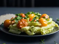 Avocado Pasta with Cherry Tomatoes and Cilantro A simple and refreshing pasta dish combining creamy avocados, juicy cherry tomatoes, and fresh cilantro, tossed with lime juice and olive oil.
