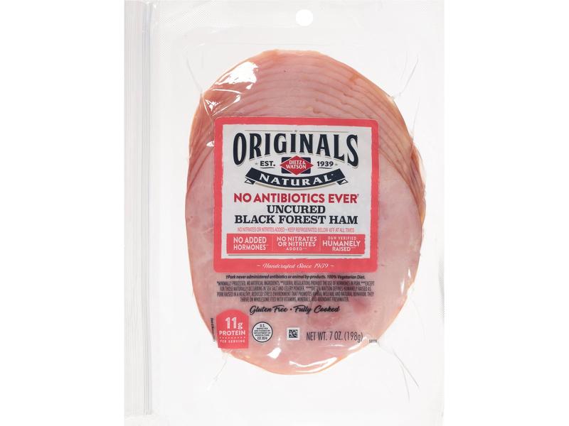 3 slices of Dietz & Watson ham, black forest, uncured contains 60 Calories. The macronutrient breakdown is 0% carbs, 17% fat, and 83% protein. This is a good source of protein (20% of your Daily Value).