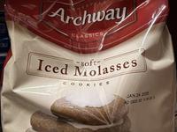 1 serving of iced molasses cookies (Archway, Home Style) contains 118 Calories. The macronutrient breakdown is 66% carbs, 31% fat, and 3% protein. This has a relatively high calorie density, with 420 Calories per 100g.