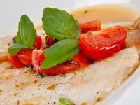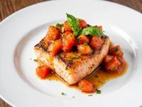 Salmon Pasta with Cherry Tomatoes and Basil A simple dish combining pan-seared salmon with pasta, cherry tomatoes, and fresh basil.