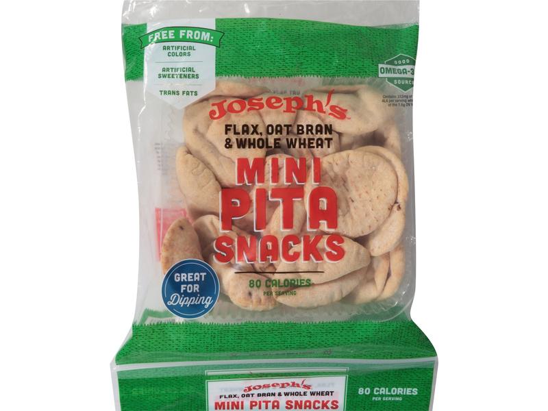 5 pitas of Joseph's pita snacks, flax, oat bran & whole wheat, mini contains 80 Calories. The macronutrient breakdown is 49% carbs, 25% fat, and 27% protein. This has a moderate calorie density, with 216 Calories per 100g.