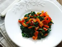 Sautéed Spinach with Garlic and Red Peppers A classic and simple side dish featuring fresh spinach sautéed with garlic and red bell peppers, seasoned with olive oil and salt. Perfect for a quick and healthy addition to any meal.