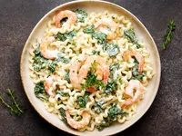 Shrimp and Spinach Alfredo A simple dish combining shrimp and pasta with fresh spinach in Alfredo sauce, topped with Parmesan cheese and a hint of nutmeg.
