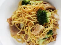 Stir-Fried Pork and Broccoli Noodles A classic stir-fry dish combining tender pork, fresh broccoli, and ramen noodles with a savory soy sauce glaze. Perfect for a quick and satisfying meal.