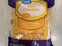 Shredded Cheese, Mild Cheddar Finely Shredded, Mild, Cheddar, Great Value | 110 | 2g | 9g | 6g |