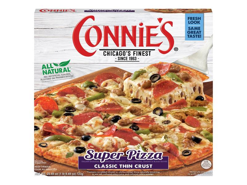 ³⁄₁₆ pizza of Connie's pizza, classic thin crust, super contains 310 Calories. The macronutrient breakdown is 32% carbs, 50% fat, and 18% protein. This is a good source of protein (25% of your Daily Value), calcium (26% of your Daily Value), and vitamin a (17% of your Daily Value).